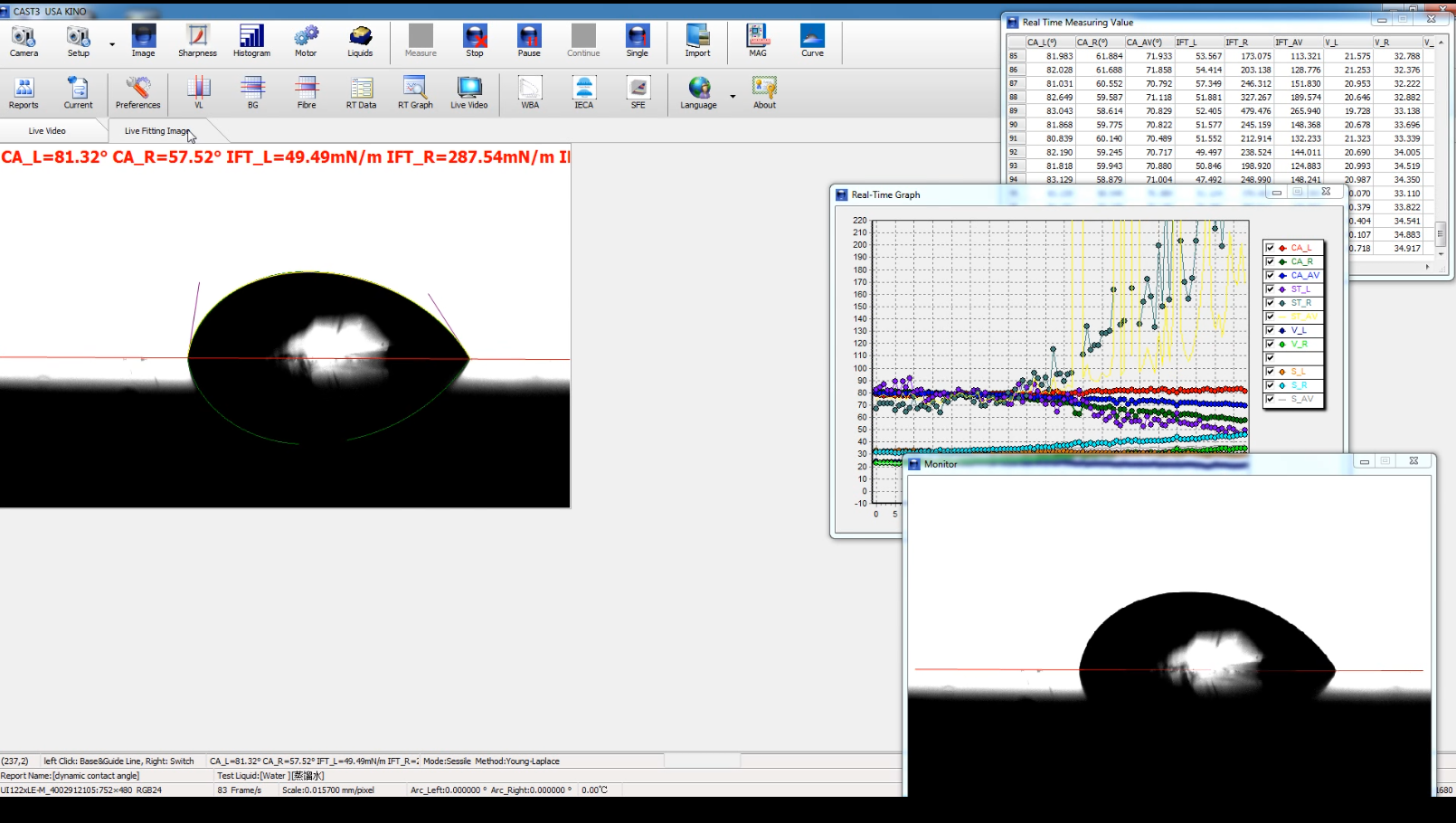 美国科诺上海研发中心以及亚太区战略投资公司上海梭伦信息科技有限公司的最新技术CAST3.0软件,独家研制成功基于Young-Laplace方程拟合技术的非轴对称法拟合前进后退角的方式,并应用于测试前进后退角值,并进而用于计算基于Wenzel-Cassie模型的本征接触角。